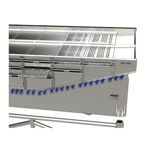 The deck construction is fully hygienic, with a design that ensures optimal cleanability. This makes the length sorter suitable for both fresh and frozen products and compliant with the high standards of the food processing industry.